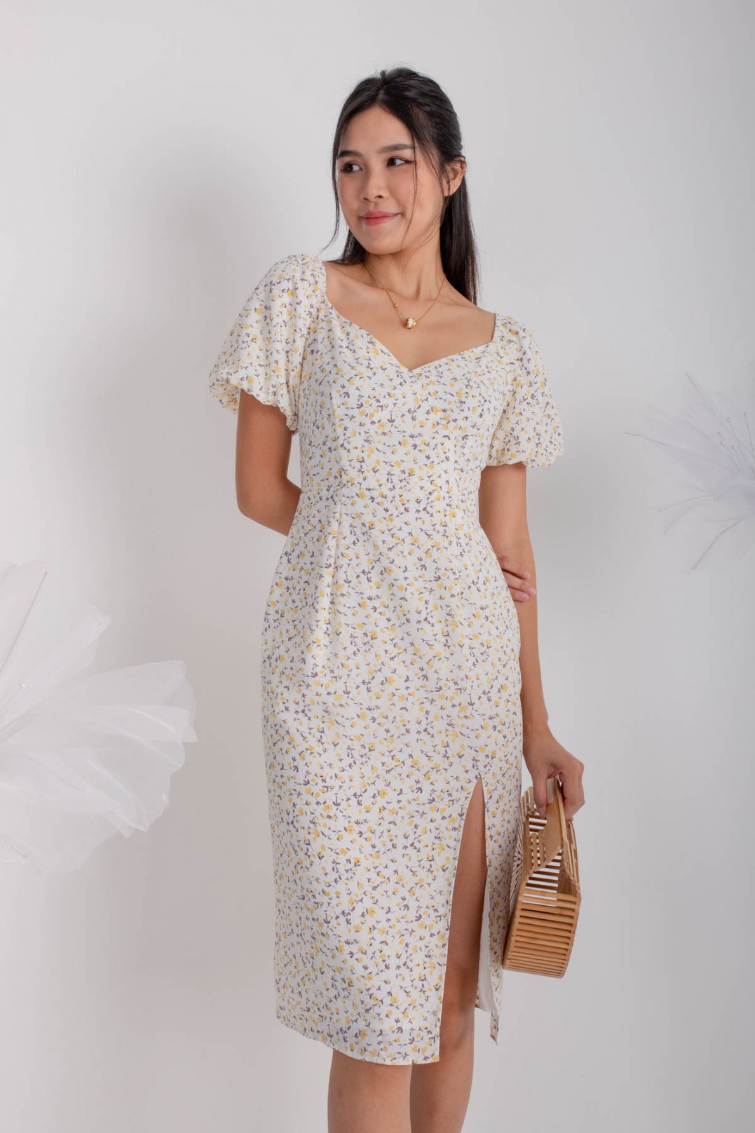 Florals are back this season. Faunia’s dainty florals and flattering v-neckline with bubble sleeves makes an ultra feminine look. Adding on a thigh slit for a touch of flirtiness, pair it with heels for a dinner date, or dress it casual with sneakers!