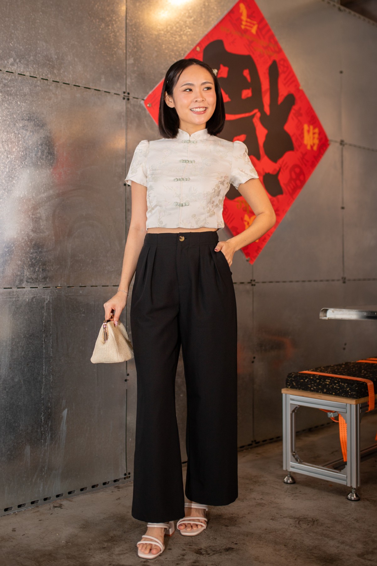 *Top only* A refined CNY statement piece that blends tradition with modern elegance! Designed with a structured silhouette and a classic mandarin-inspired neckline, it features fabric-covered knot buttons that add a subtle festive touch. Crafted with a delicate floral weave, this top feels polished yet lightweight, perfect for CNY gatherings and reunion dinners. Pairs well with Prosperity Jacquard Skirt, or can be styled with other bottoms!